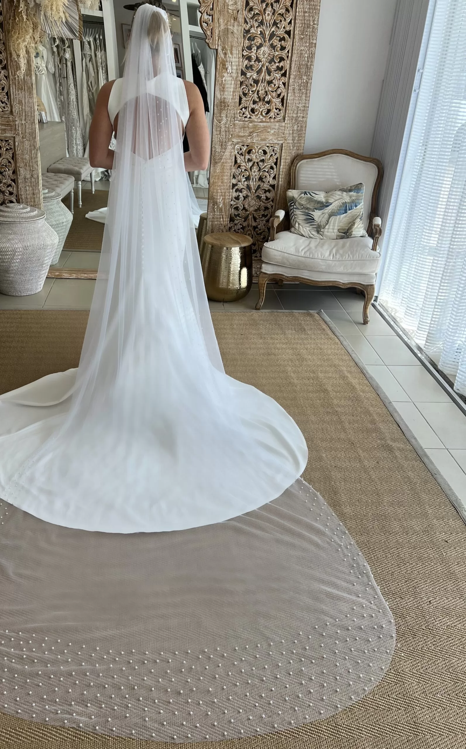 A textural accompaniment that luxifies any bridal look. Cathedral length Pearl studded Italian tulle veil with comb.