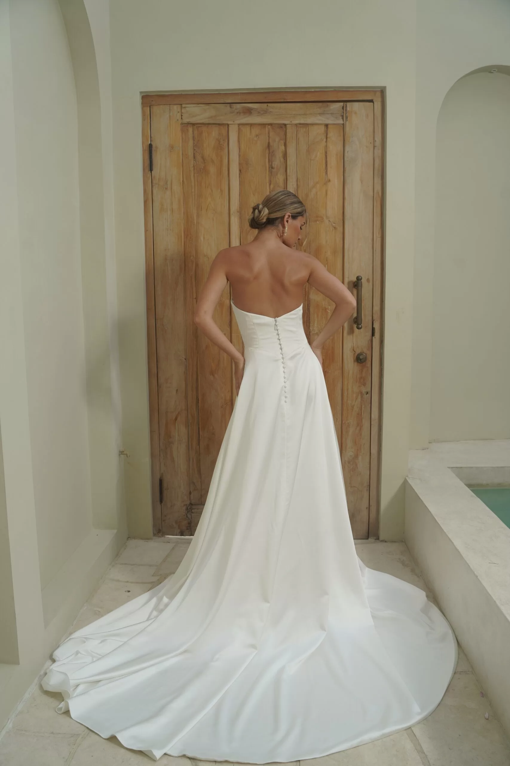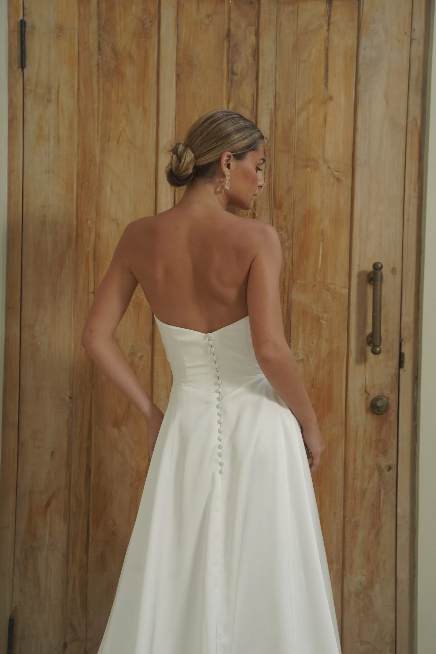 This stunning gown is completed with satin-covered buttons at the back and a long, yet never heavy, train.