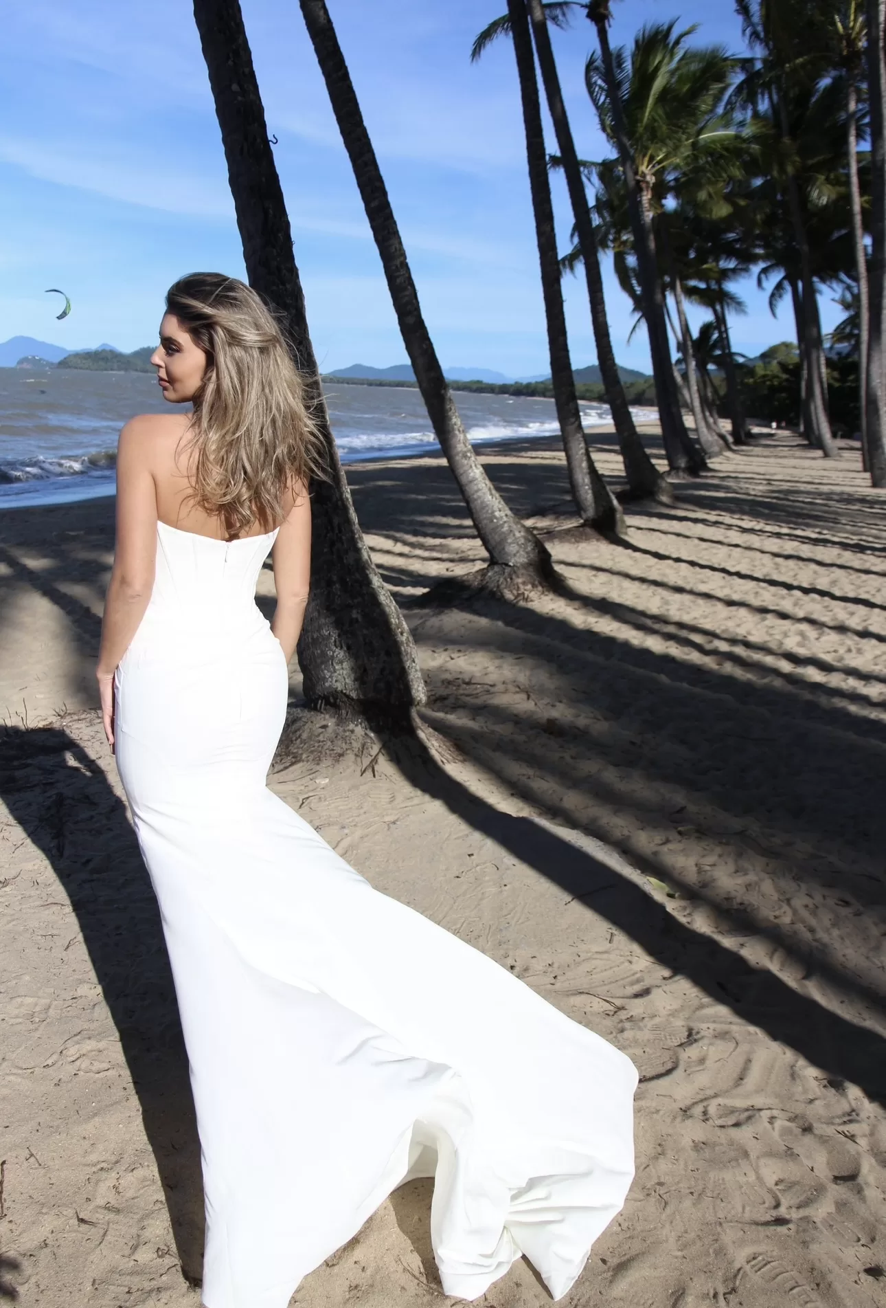 Ruching over the buttocks and an extra long train complete this dramatic look.