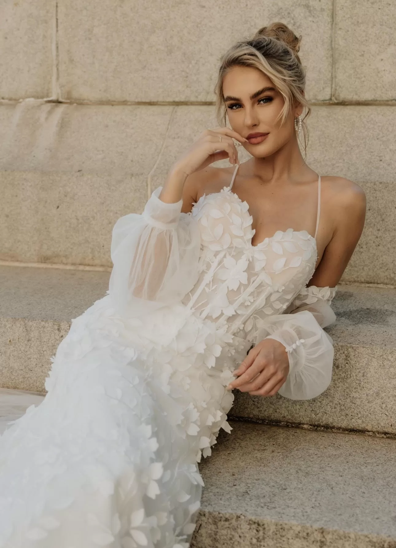 Paris is for our brides who adore next level lace and a couture look and feel. Her lace evokes floral abundance and is an ideal composition for an unlined bodice as it both hugs the body, while providing perfect coverage. Her exposed boning and V waist slim and shape the upper body and her gorgeous fitted skirt provide a lengthened silhouette. Romantic lace-embellished tulle sleeves are an optional accompaniment. The lace is further showcased in Paris’s show shopping train and a super low back add to her wow factor.
