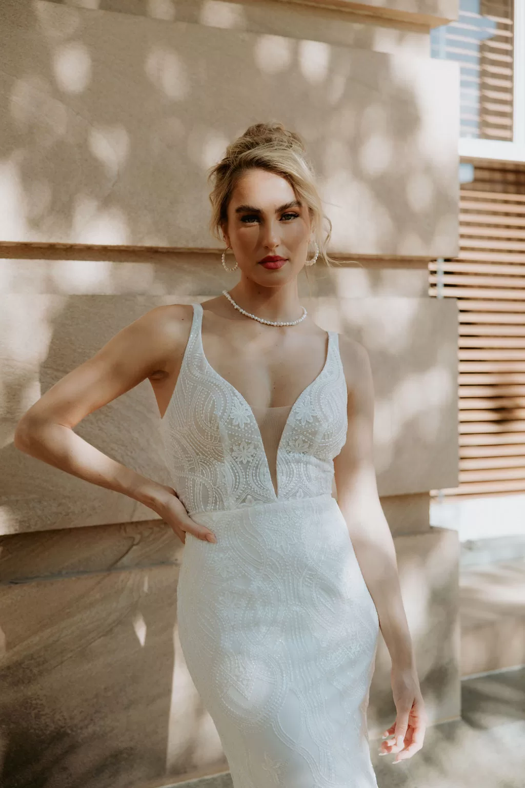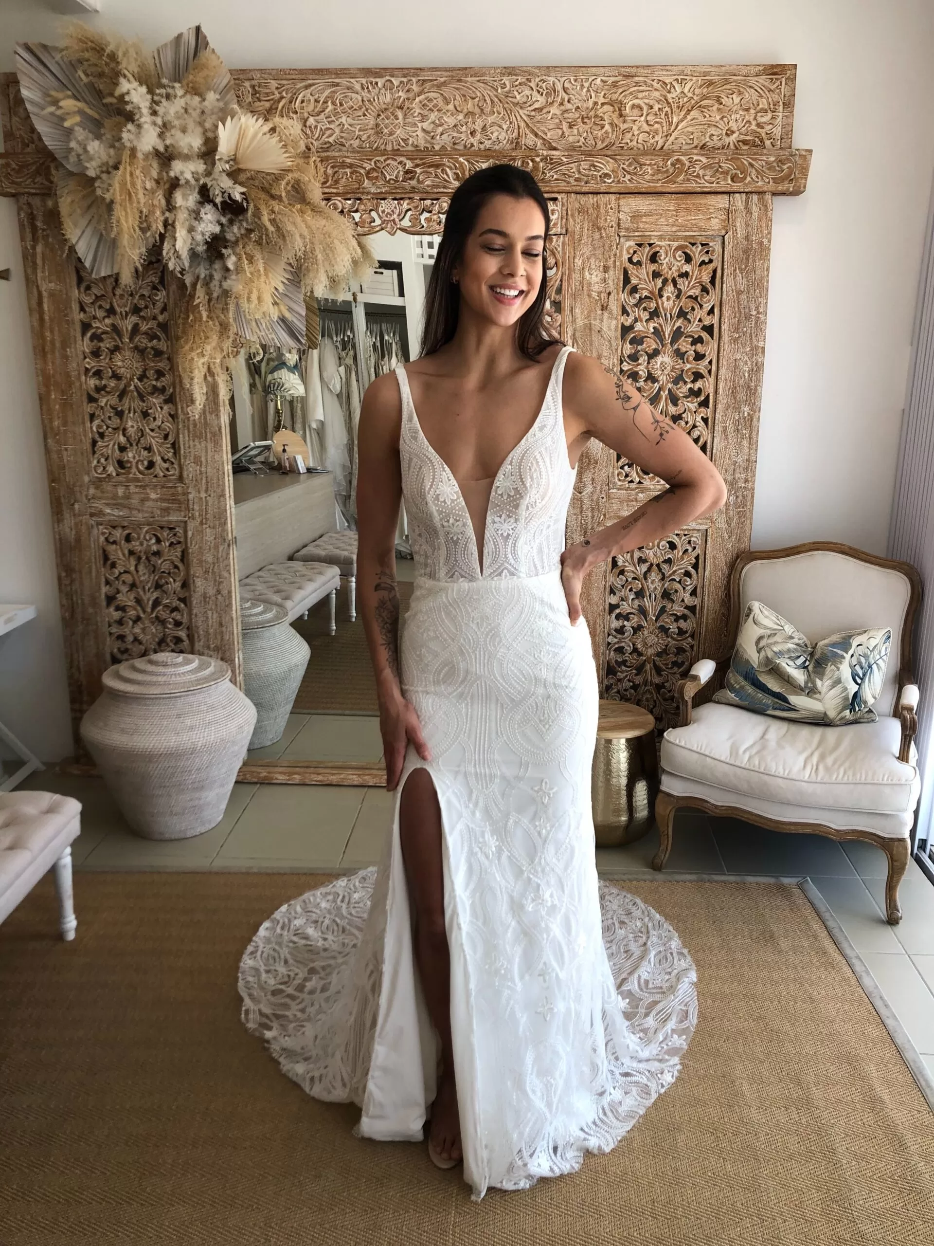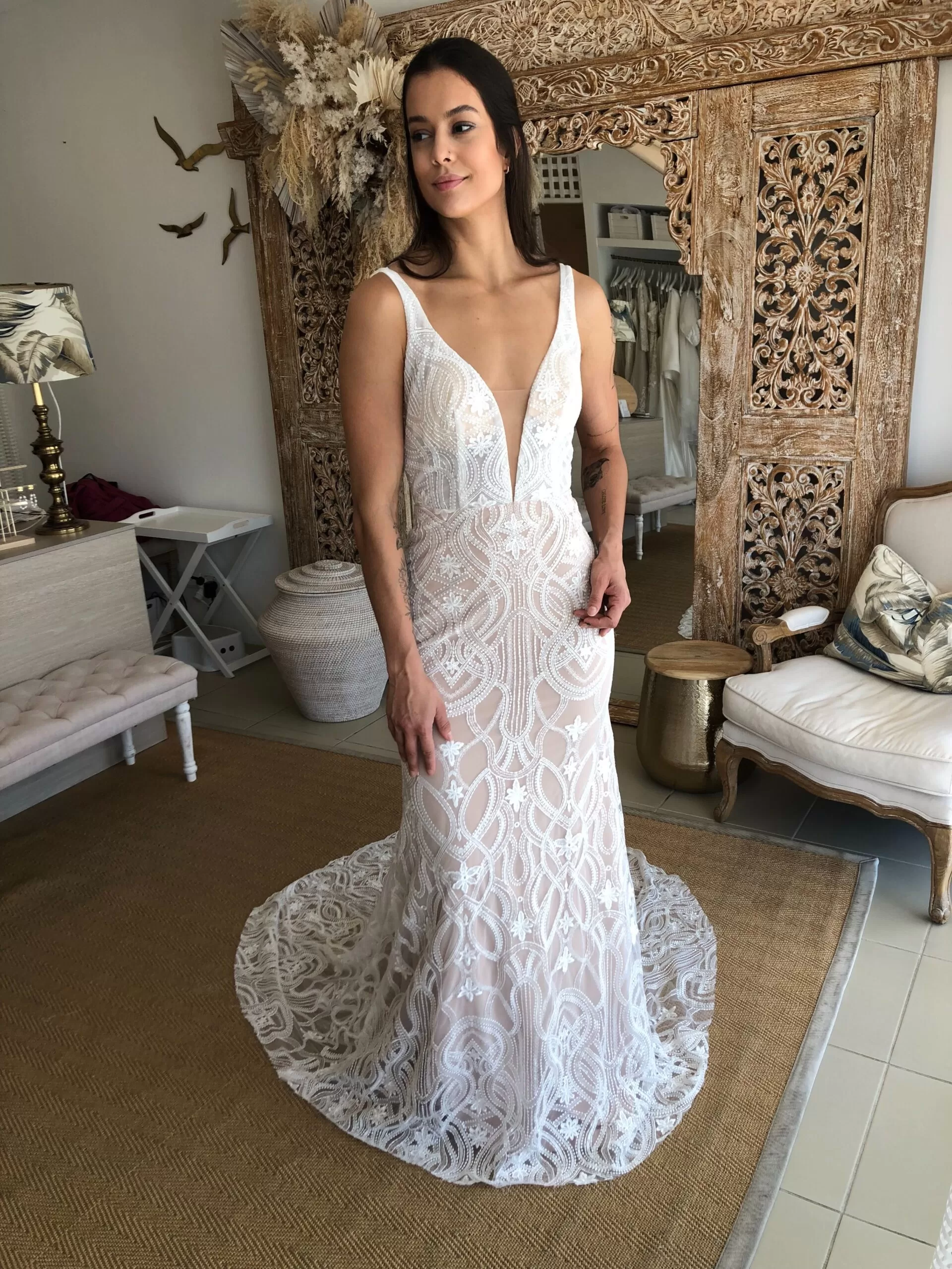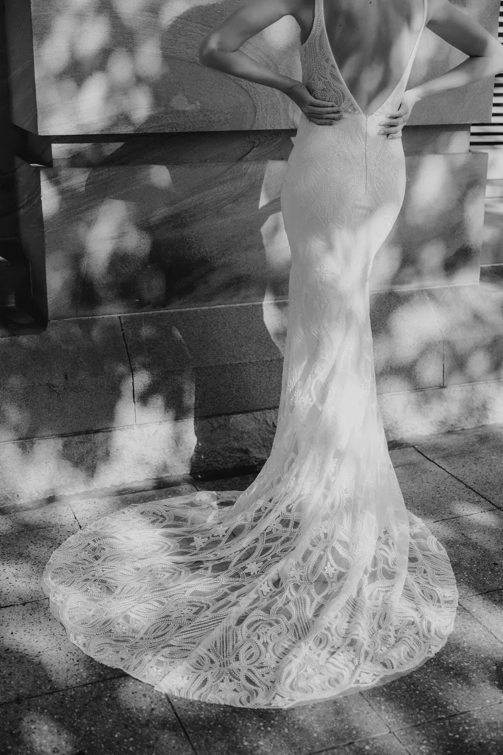 Made to order pieces will be available to ship 5 months after ordering your size and supplying your heel height. If your wedding date is sooner, please contact us with details of your wedding date and preferred size and we will advise you of rush order availability. Sale gowns ship the week after purchase via registered post. Shipping on items over $300 is free of charge worldwide.