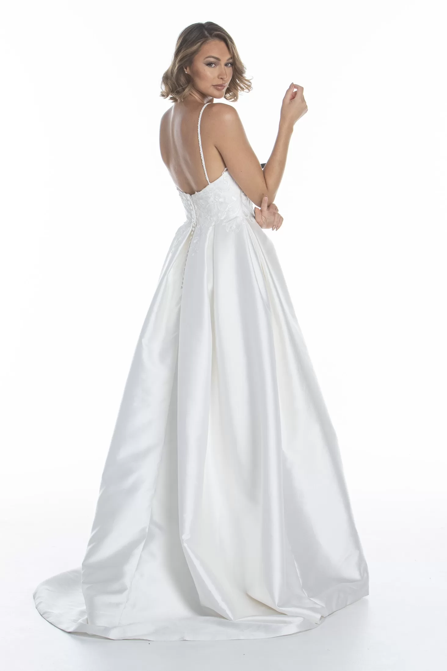 For the on trend bride who adores fabrics and textures in a show stopping silhouette. This incredible gown features embroidered lace on lustrous mikado satin with a flattering body shaping box-pleat skirt. Prepare for some magical imagery in Mikado constrained only by the imagination.